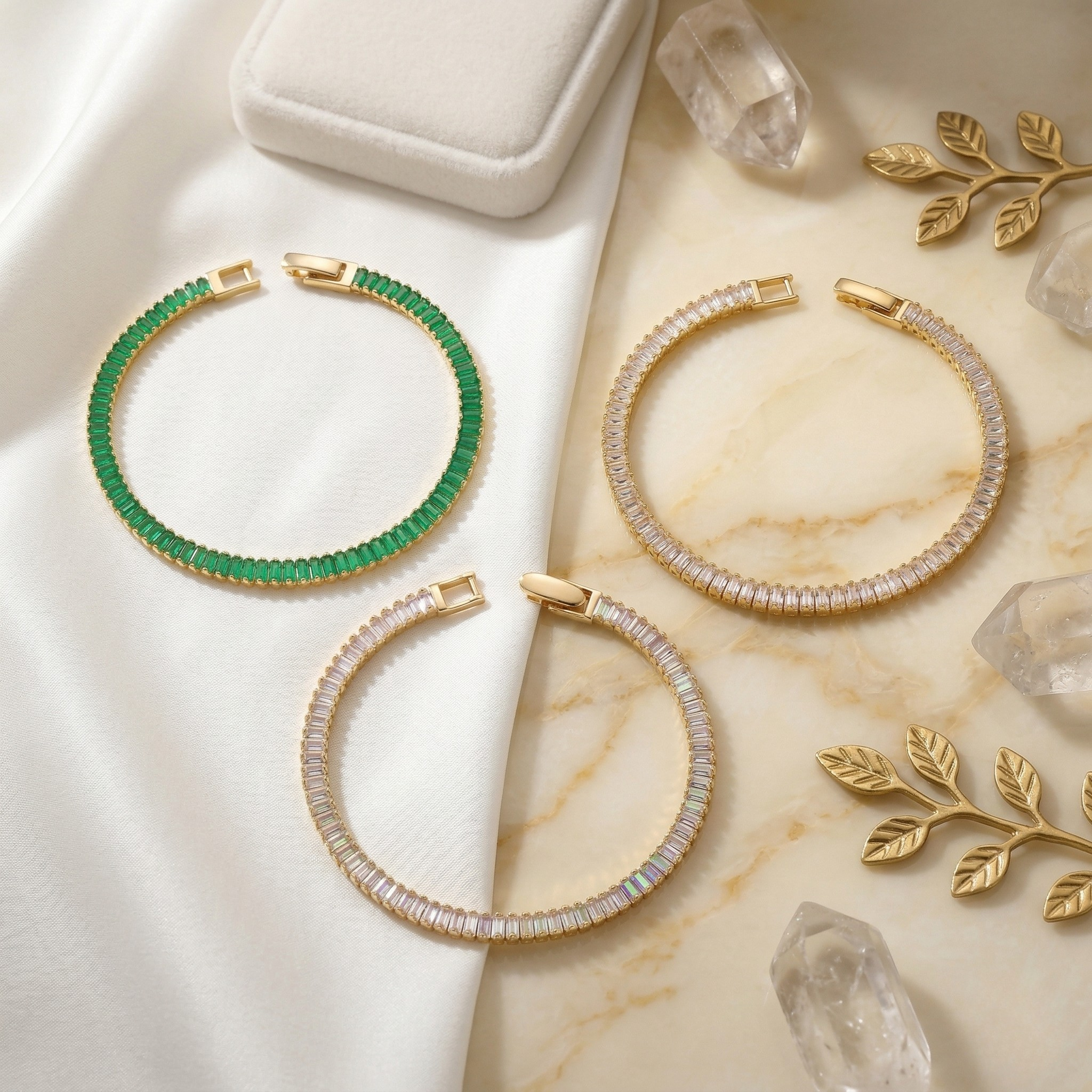 Elegant gold-plated tennis bracelet featuring sparkling emerald green baguette stones for a luxurious and timeless look.
