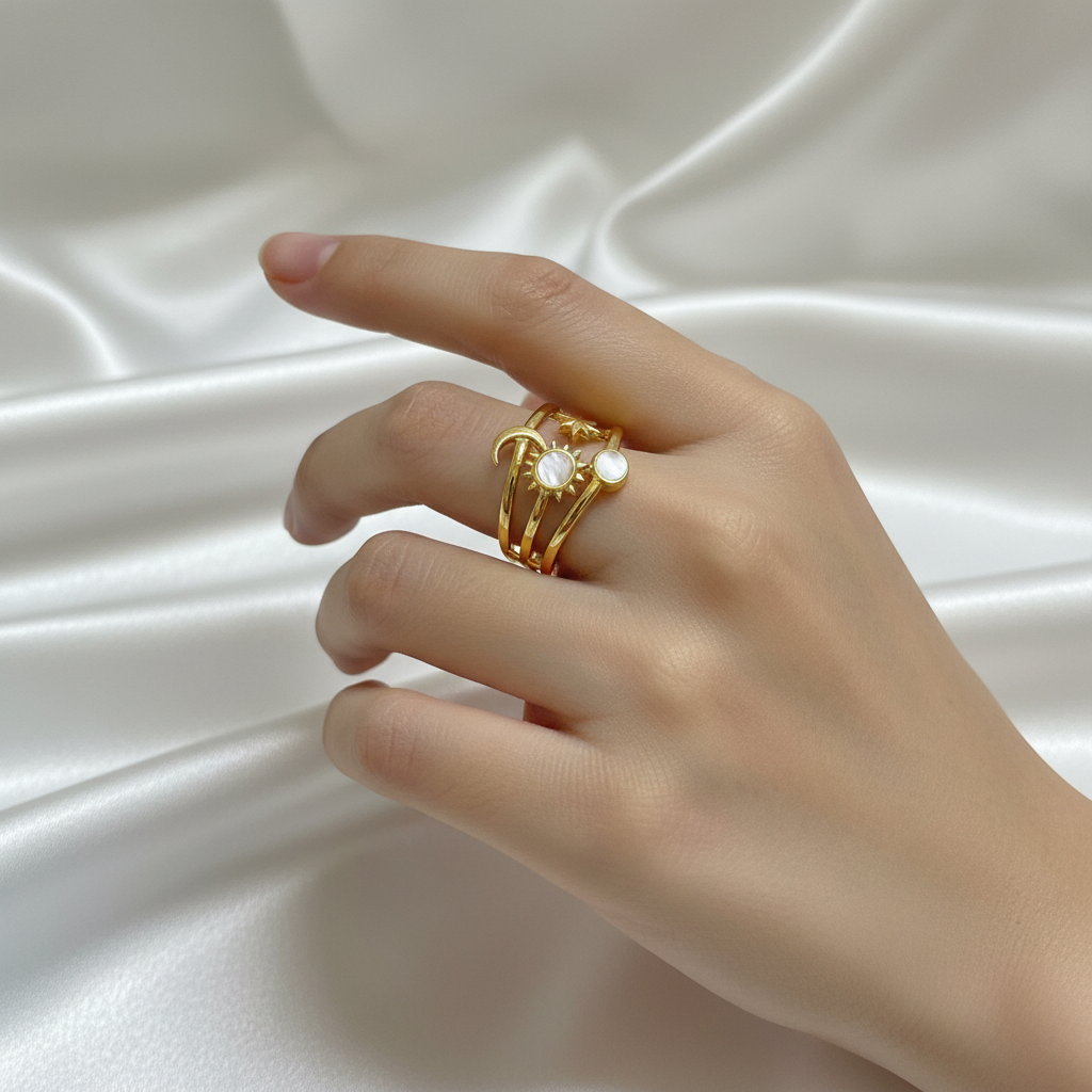 A beautiful celestial-inspired adjustable ring featuring sun, moon, and star motifs with elegant white stones. Perfect for adding a mystical and stylish touch to your jewelry collection.