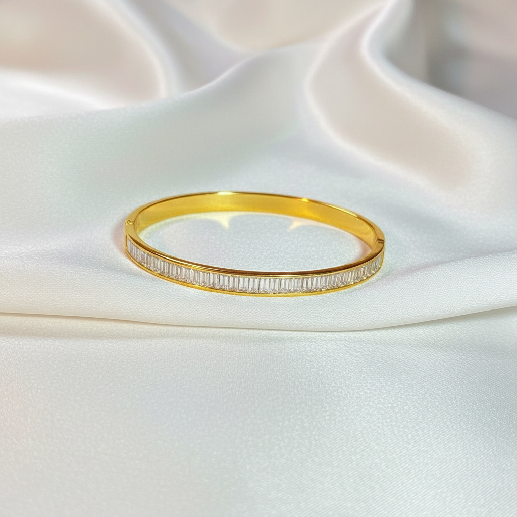 This stunning Crystal Bar Gold Bangle is designed for women who appreciate minimal luxury and timeless elegance. The bangle features a sleek gold band with a row of finely set crystals that create a subtle yet eye-catching sparkle.