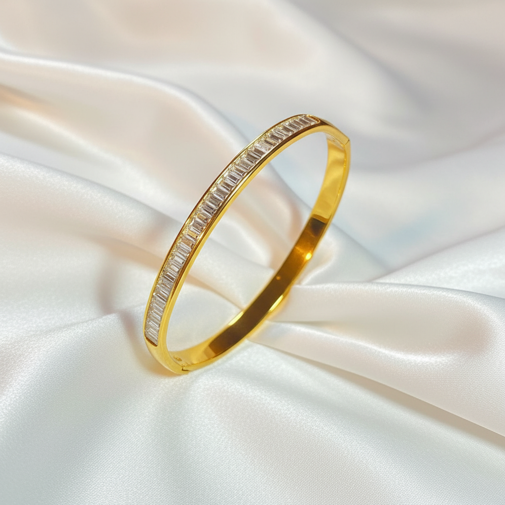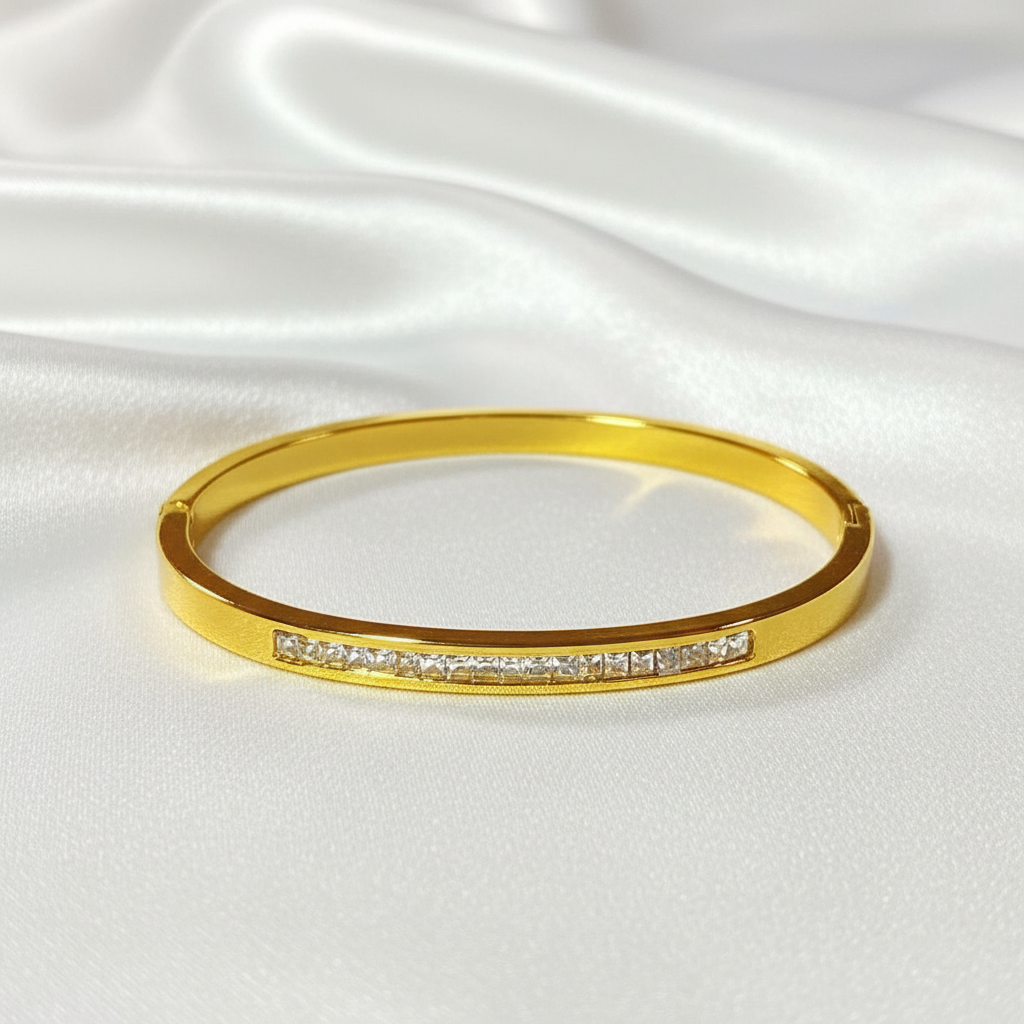 Sleek gold bangle with a crystal bar design, crafted from stainless steel. Minimal, elegant, and perfect for everyday or layered styling.