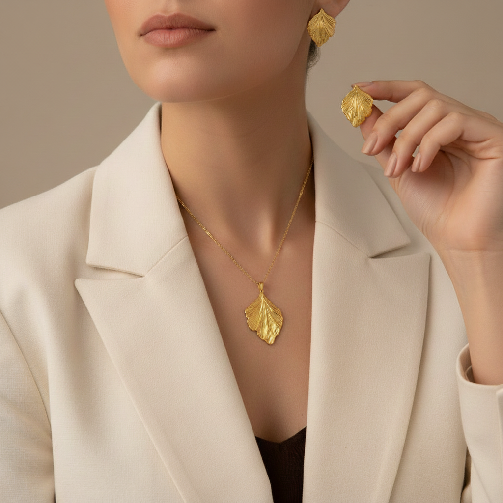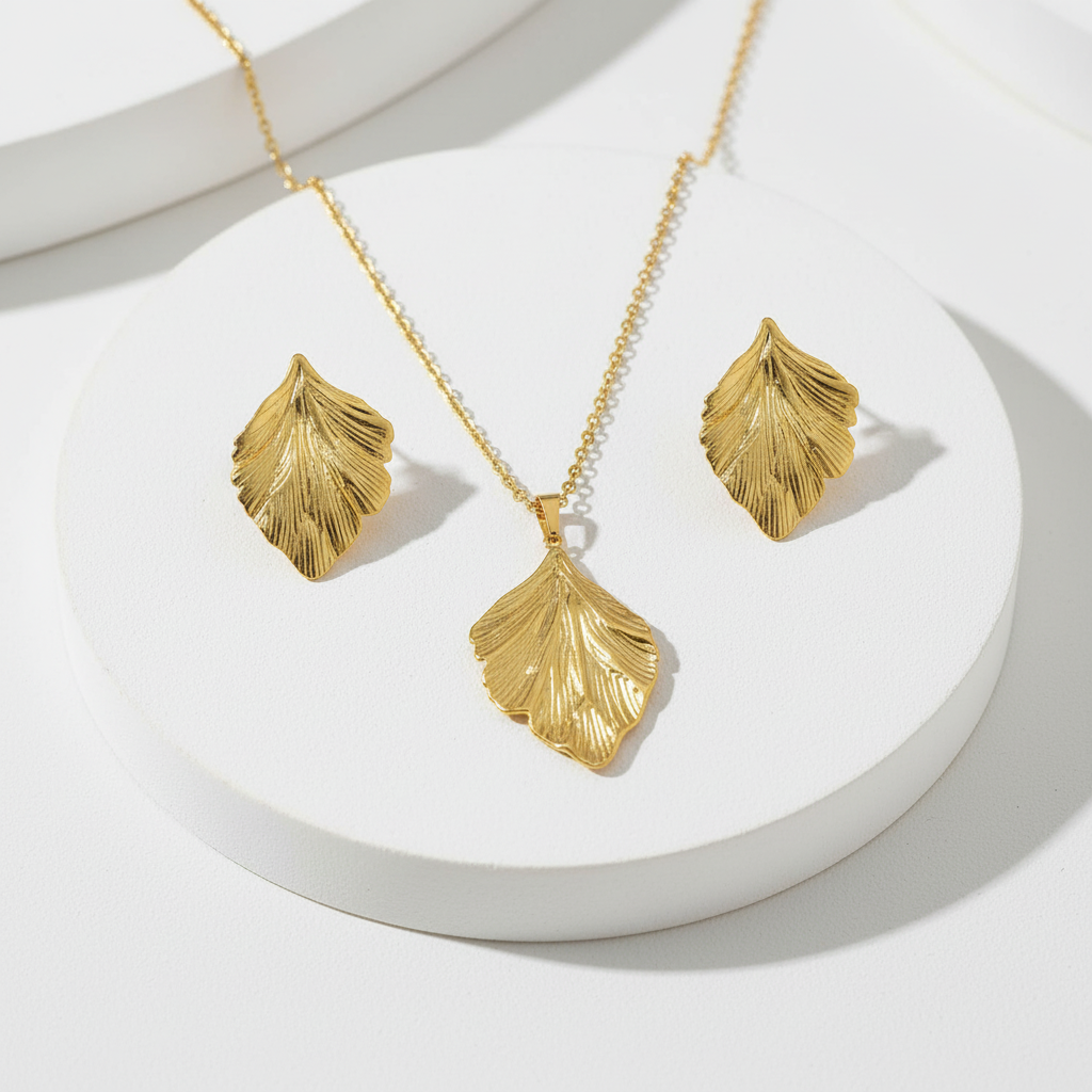 Elegant Leaf Pendant Necklace & Earrings Set – Gold Plated Jewelry Set for Women