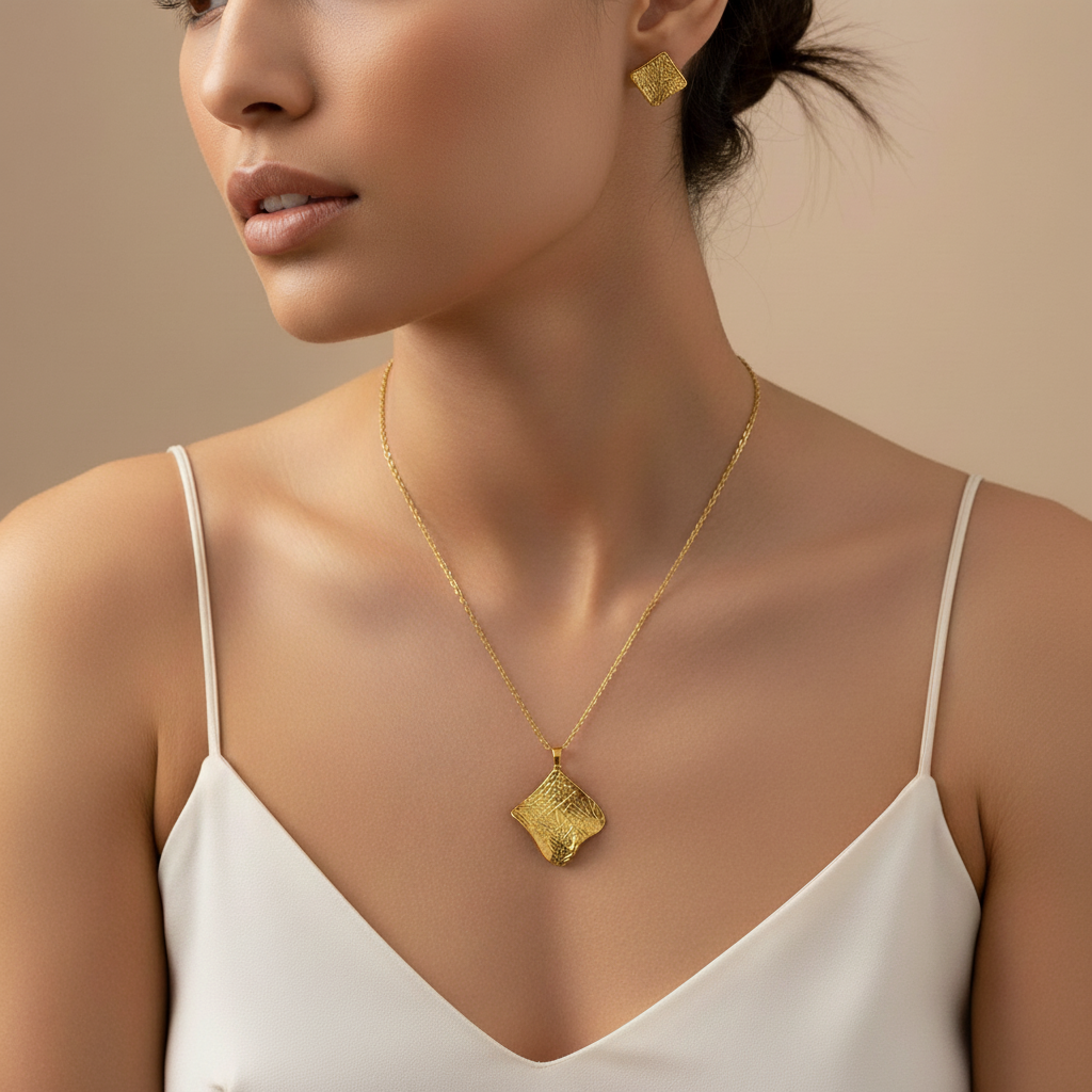 A stylish leaf design jewelry set featuring a textured gold pendant necklace with matching leaf earrings. Perfect for adding a touch of elegance to everyday outfits and special occasions.