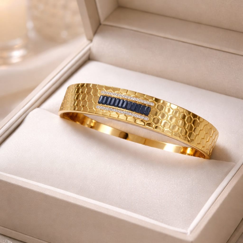 Geometric Sapphire Inlay Gold Honeycomb Design Bangle