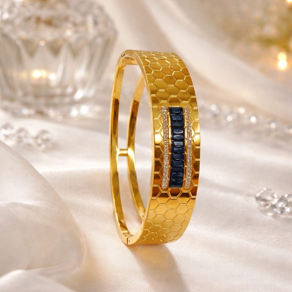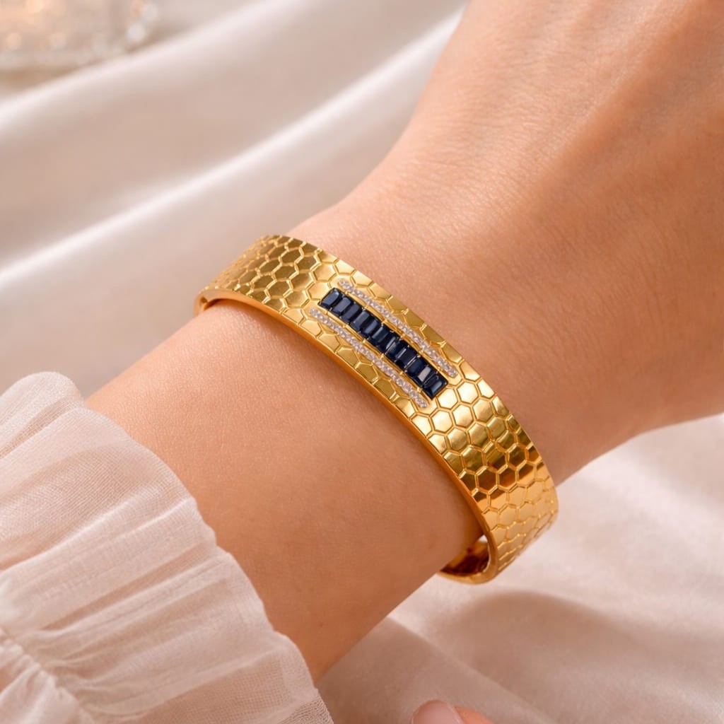 Elegant and modern, this gold-tone bangle features a sleek sapphire-toned inlay with sparkling zirconia accents and a unique honeycomb texture — perfect for effortless everyday luxury.
