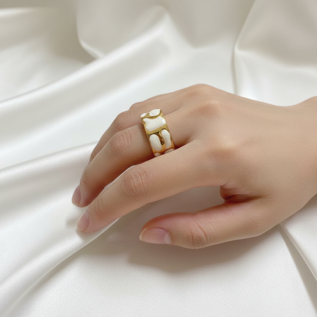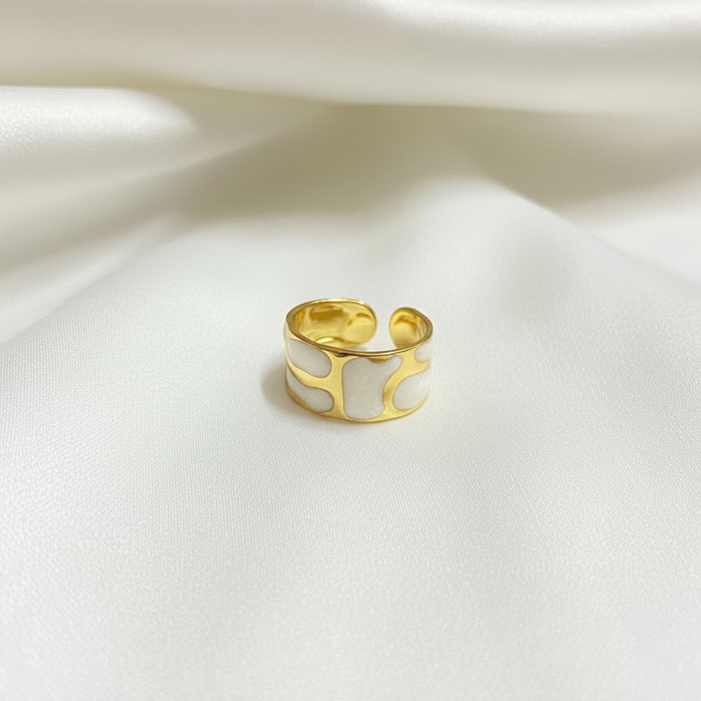 A stylish gold adjustable ring featuring a modern white enamel pattern. Elegant, minimalist, and perfect for everyday fashion.