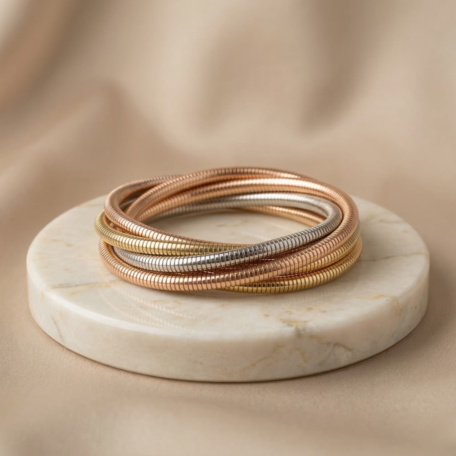 Featuring a coiled layered design in gold, rose gold, and silver tones, this bangle creates a stacked look while being a single elegant piece.