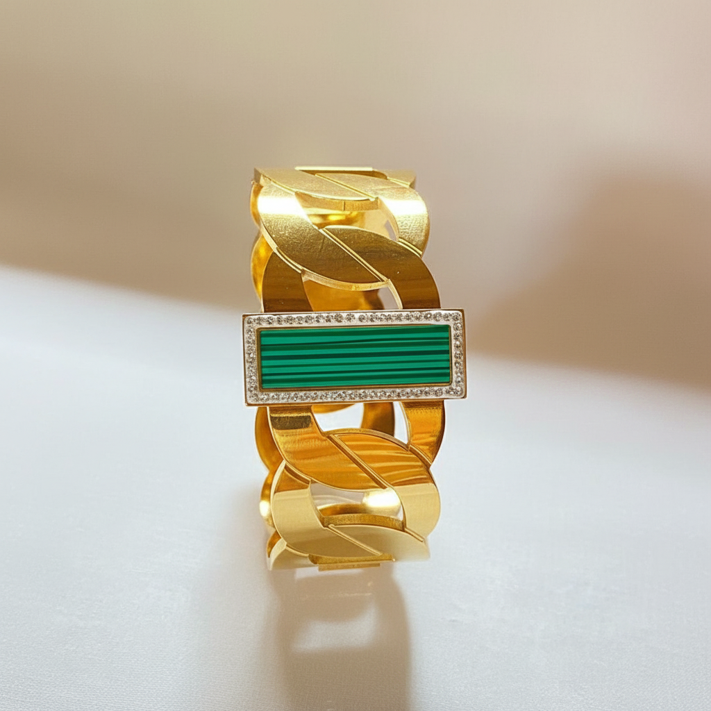 Bold gold bangle featuring a chunky chain design. Stylish, durable, and perfect for statement and party wear.
