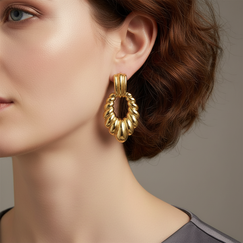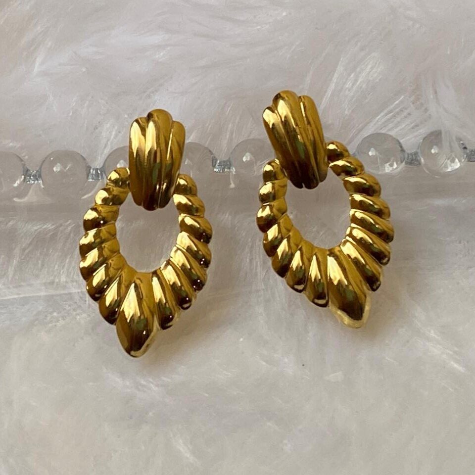 Bold gold oval drop earrings with a textured ribbed design. Perfect for statement styling and elegant occasions.