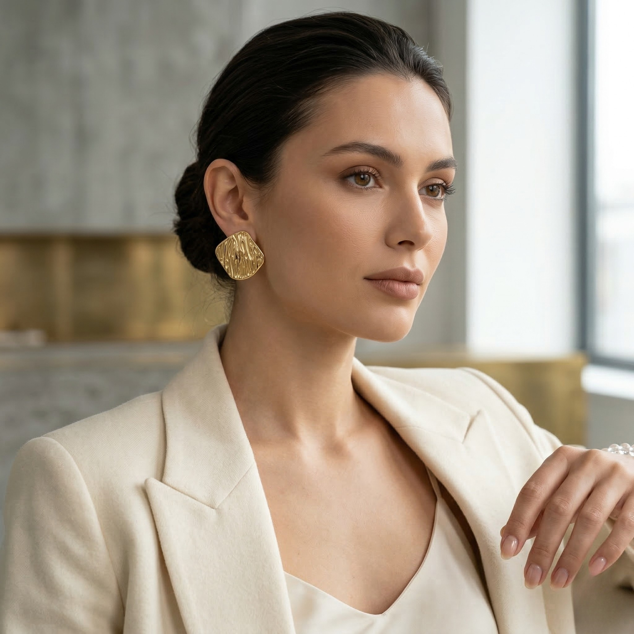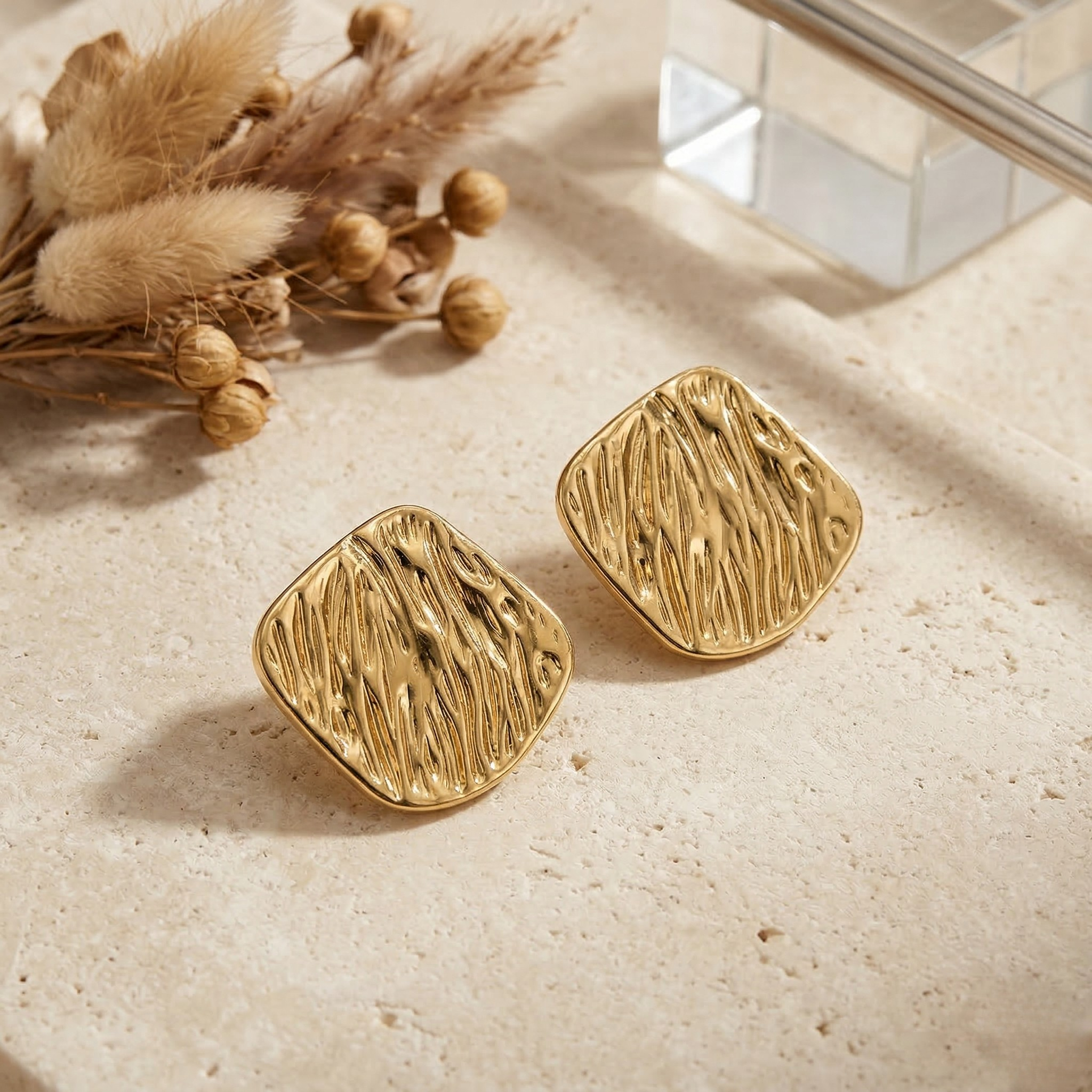 Elegant gold textured stud earrings with a modern abstract design. Perfect for office wear and special occasions.