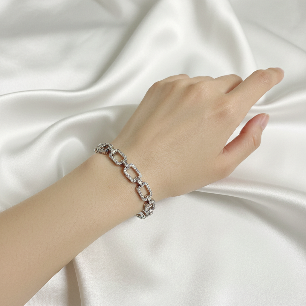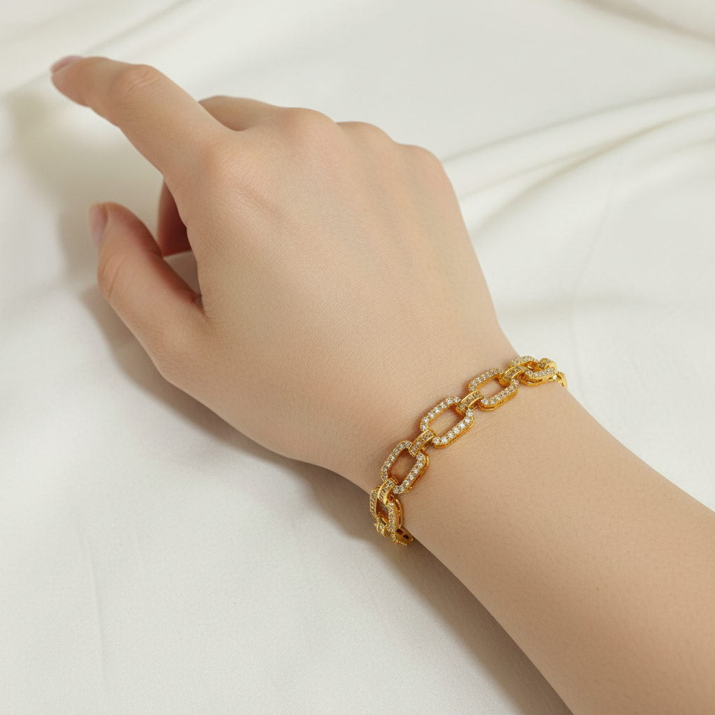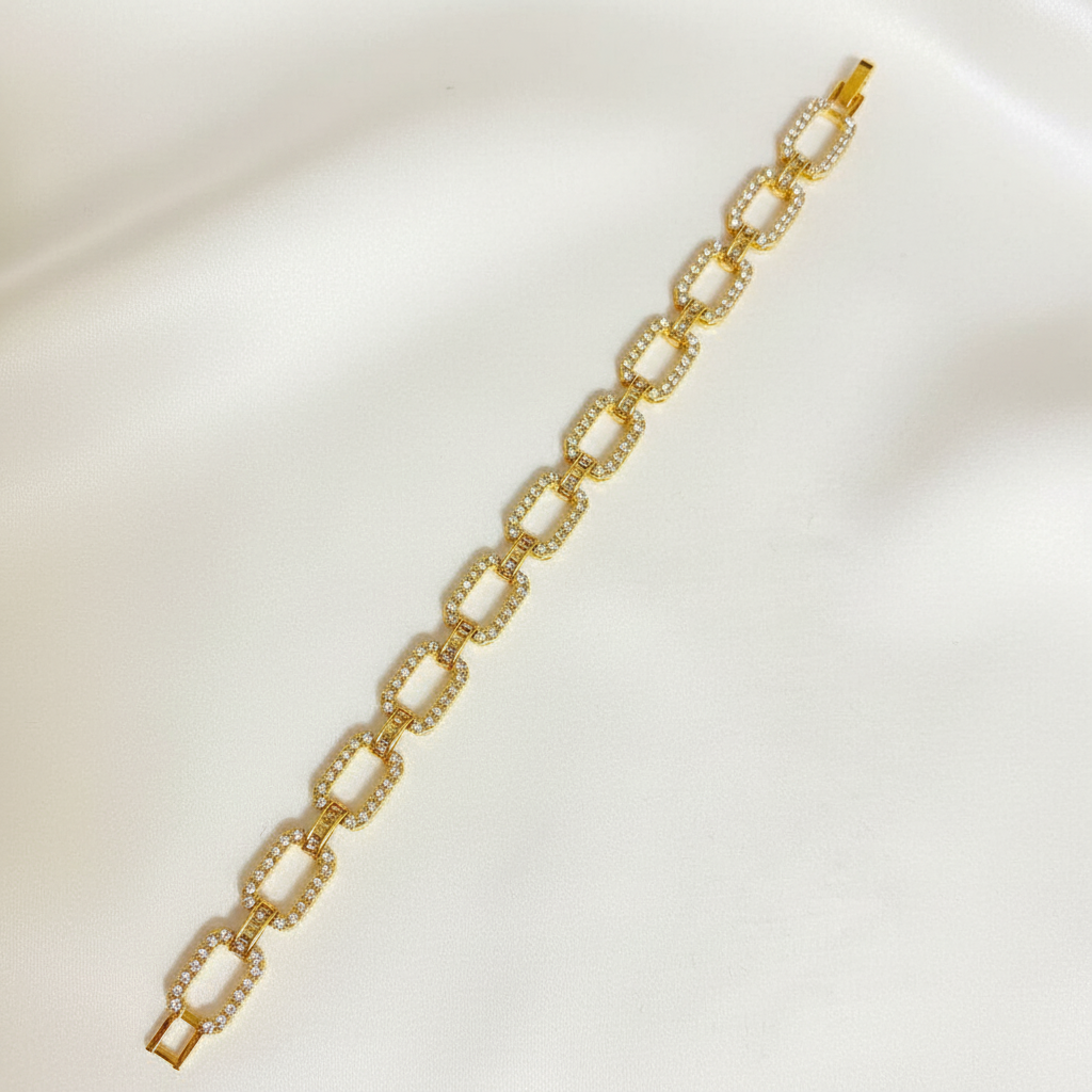 A modern and elegant bracelet featuring rectangular crystal-studded links connected in a sleek chain design. Available in gold and silver finishes, this bracelet adds sparkle and sophistication to any outfit.