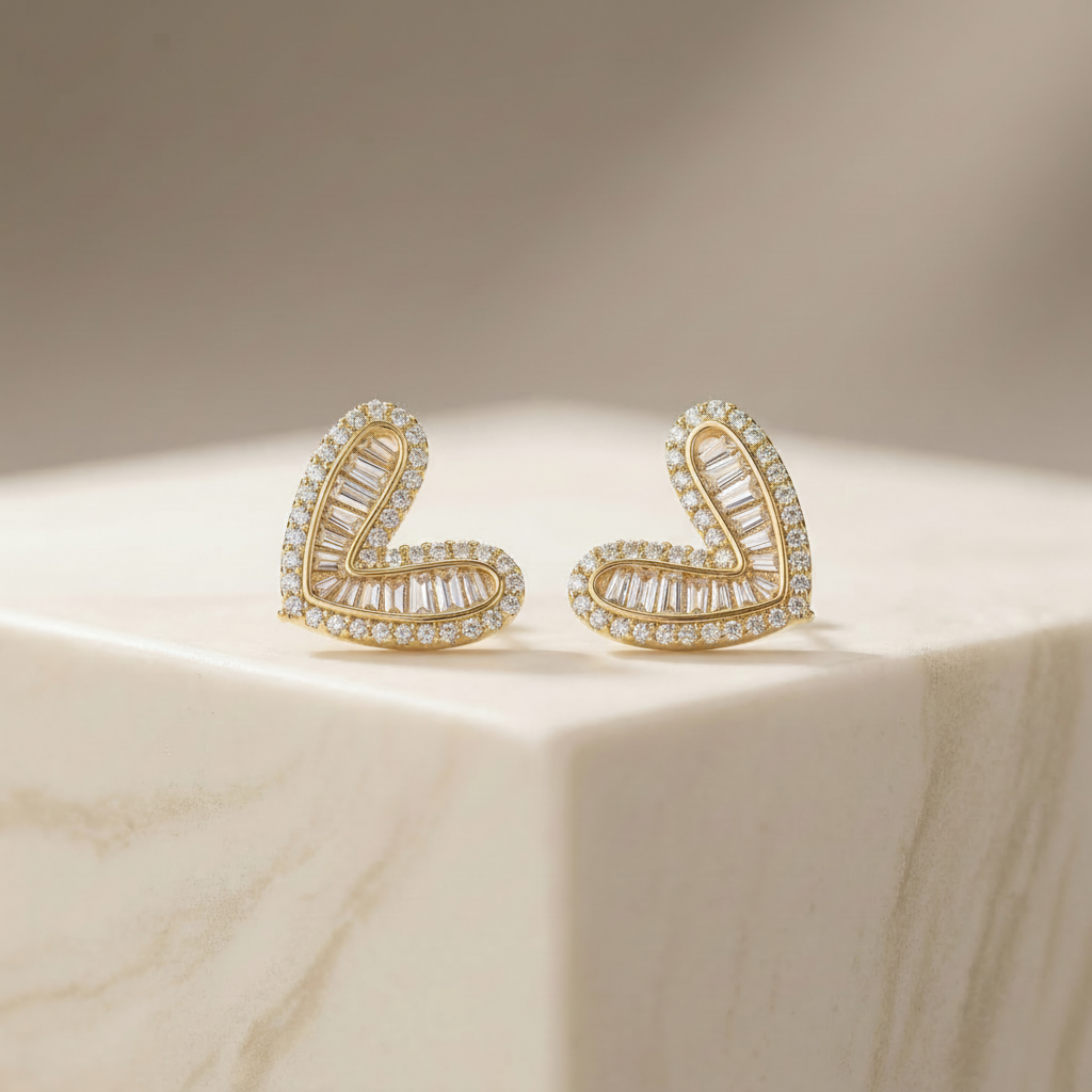 Elegant heart-shaped stud earrings with sparkling crystals in a gold finish. Perfect for gifting, parties, and everyday elegance.