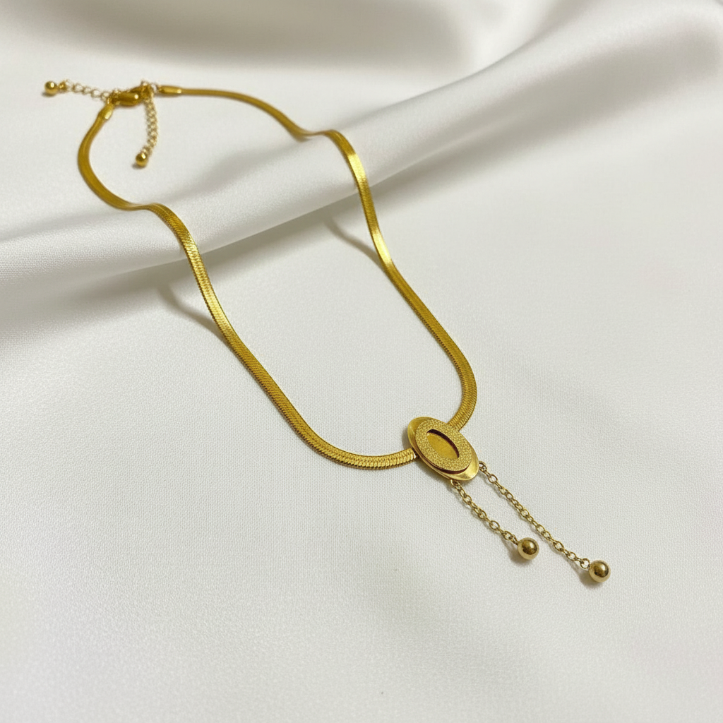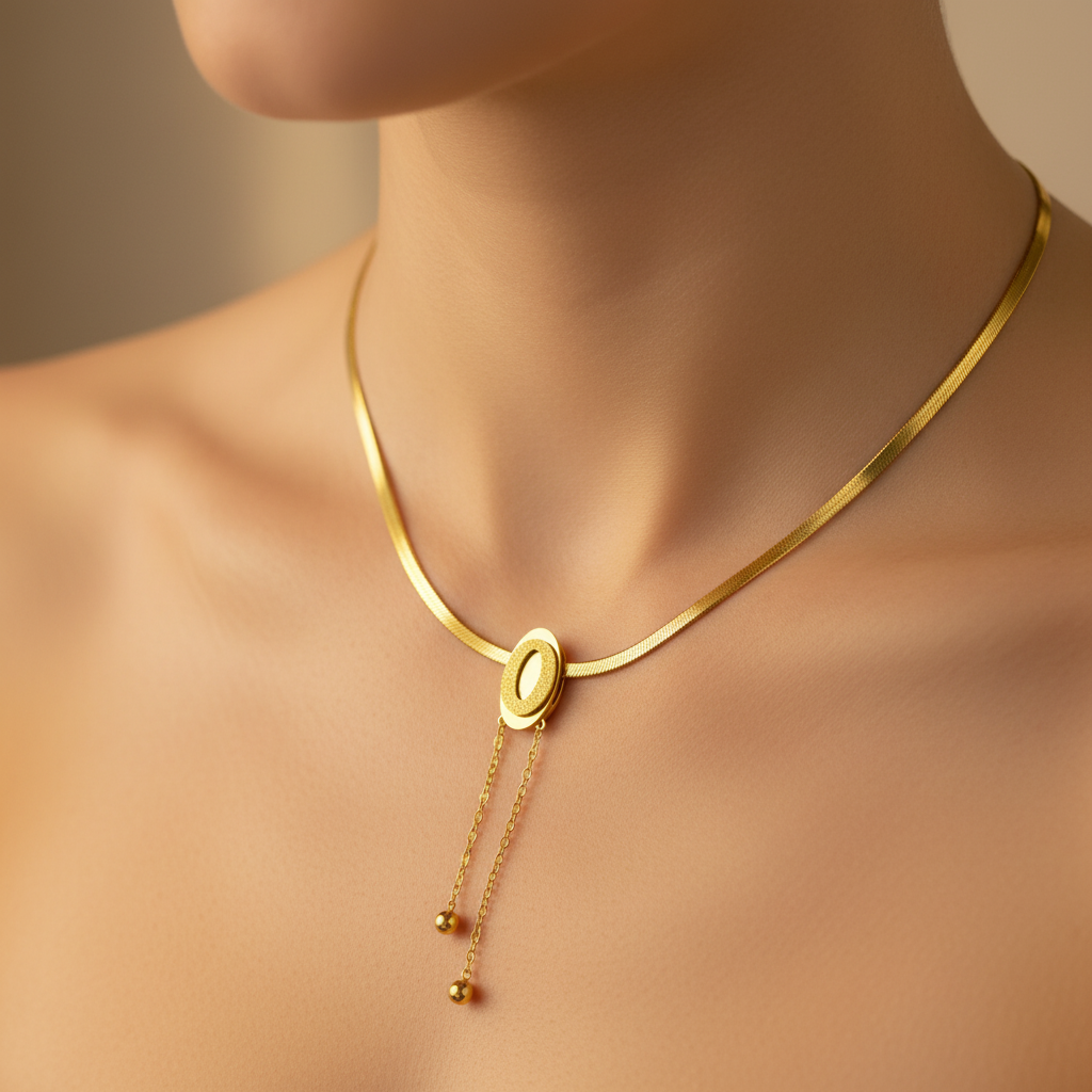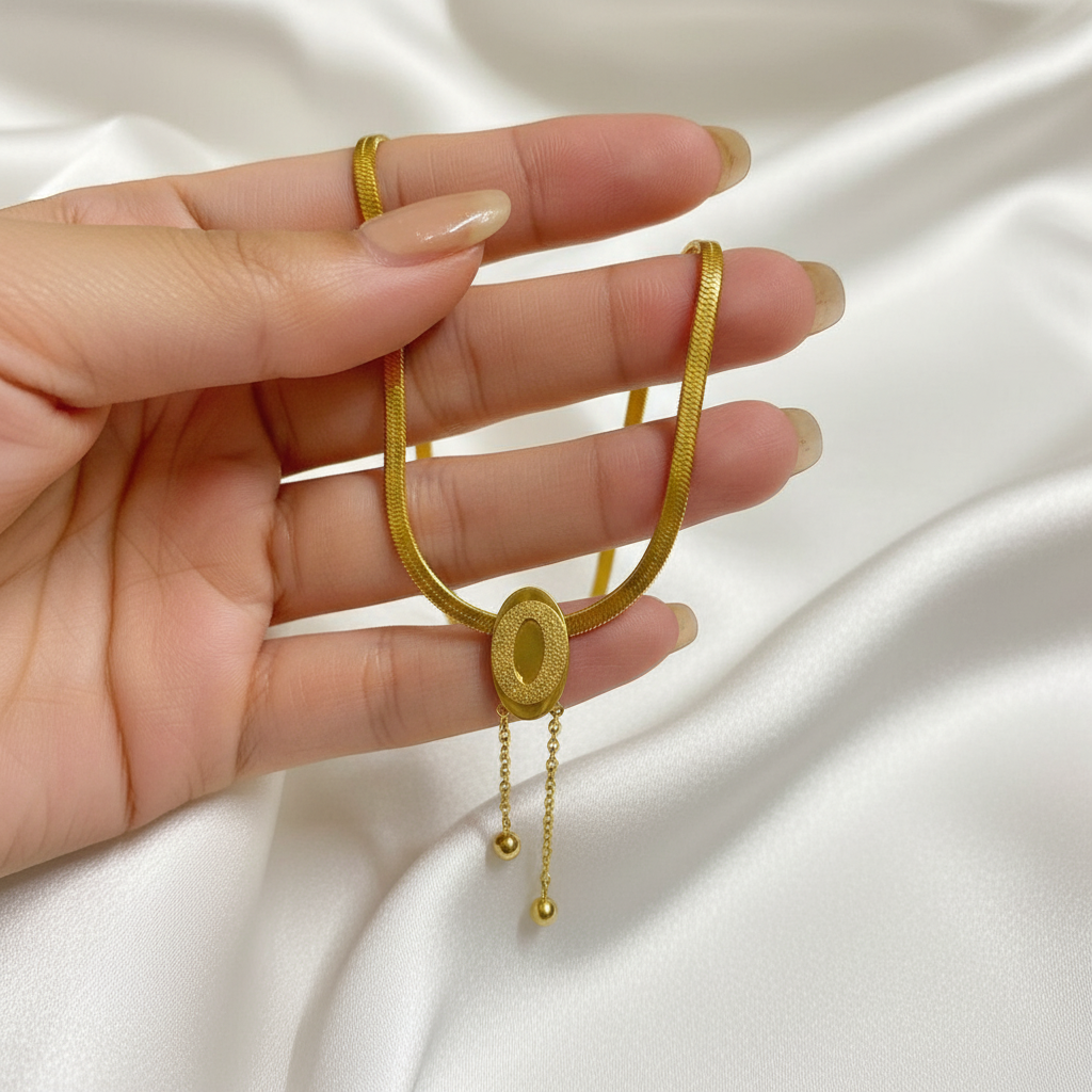 The centerpiece oval pendant features two delicate hanging chains finished with small gold beads, creating graceful movement and a refined statement. The smooth snake chain design sits comfortably on the neckline, making it ideal for everyday wear as well as special occasions.