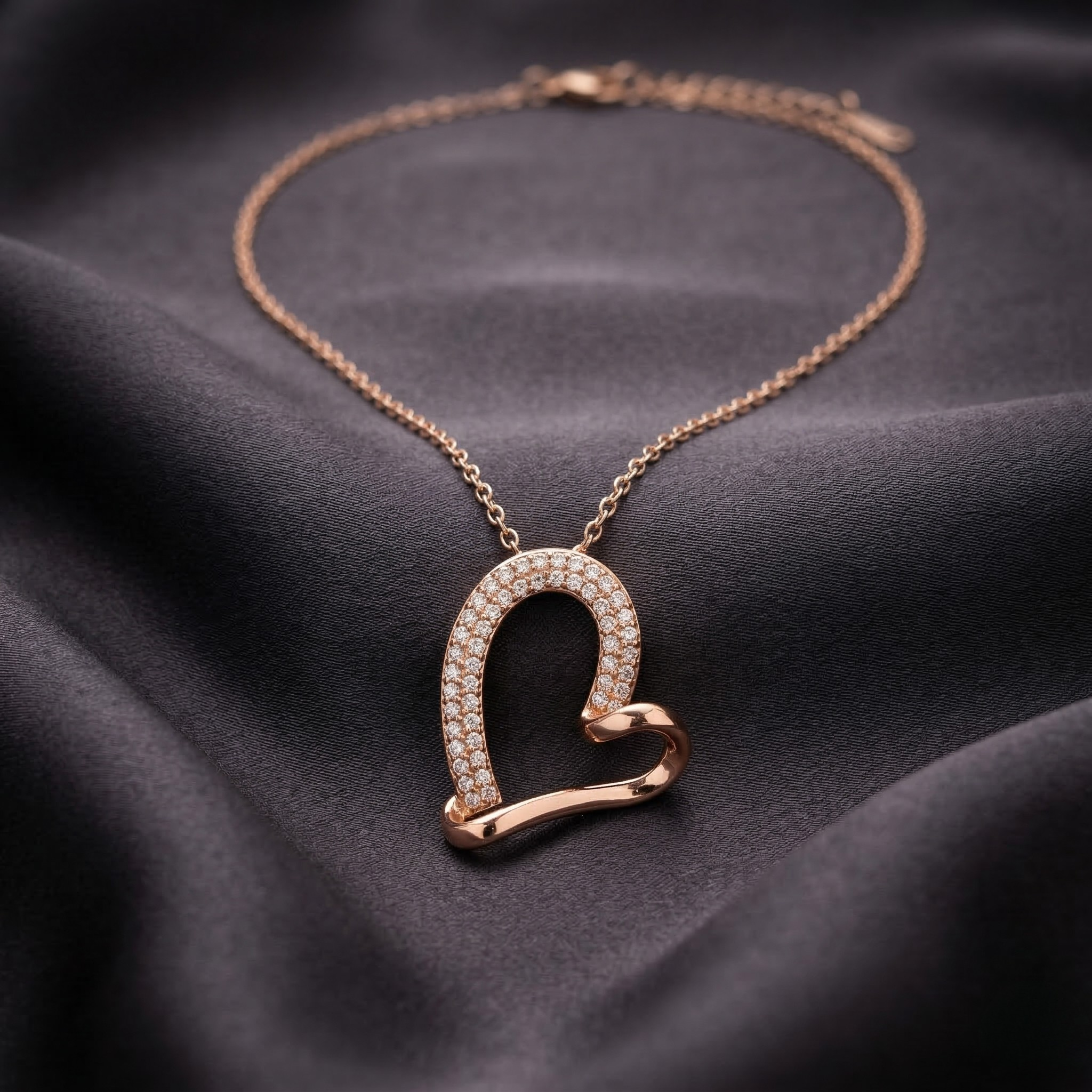 Stylish rose gold abstract heart necklace with sparkling crystals, designed for a modern and elegant romantic look.