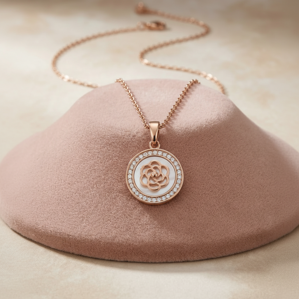 Graceful rose gold necklace featuring a floral design inside a crystal-studded circle—perfect for timeless elegance and gifting.
