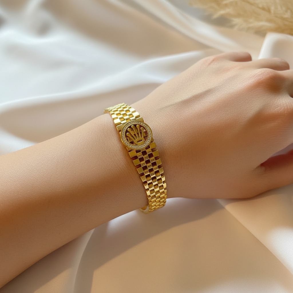 Add a touch of royalty to your jewelry collection with this beautifully designed Royal Crown Gold Lattice Bangle. Crafted with a unique open lattice pattern and a striking crown emblem at the center, this bangle symbolizes elegance, luxury, and timeless style.
